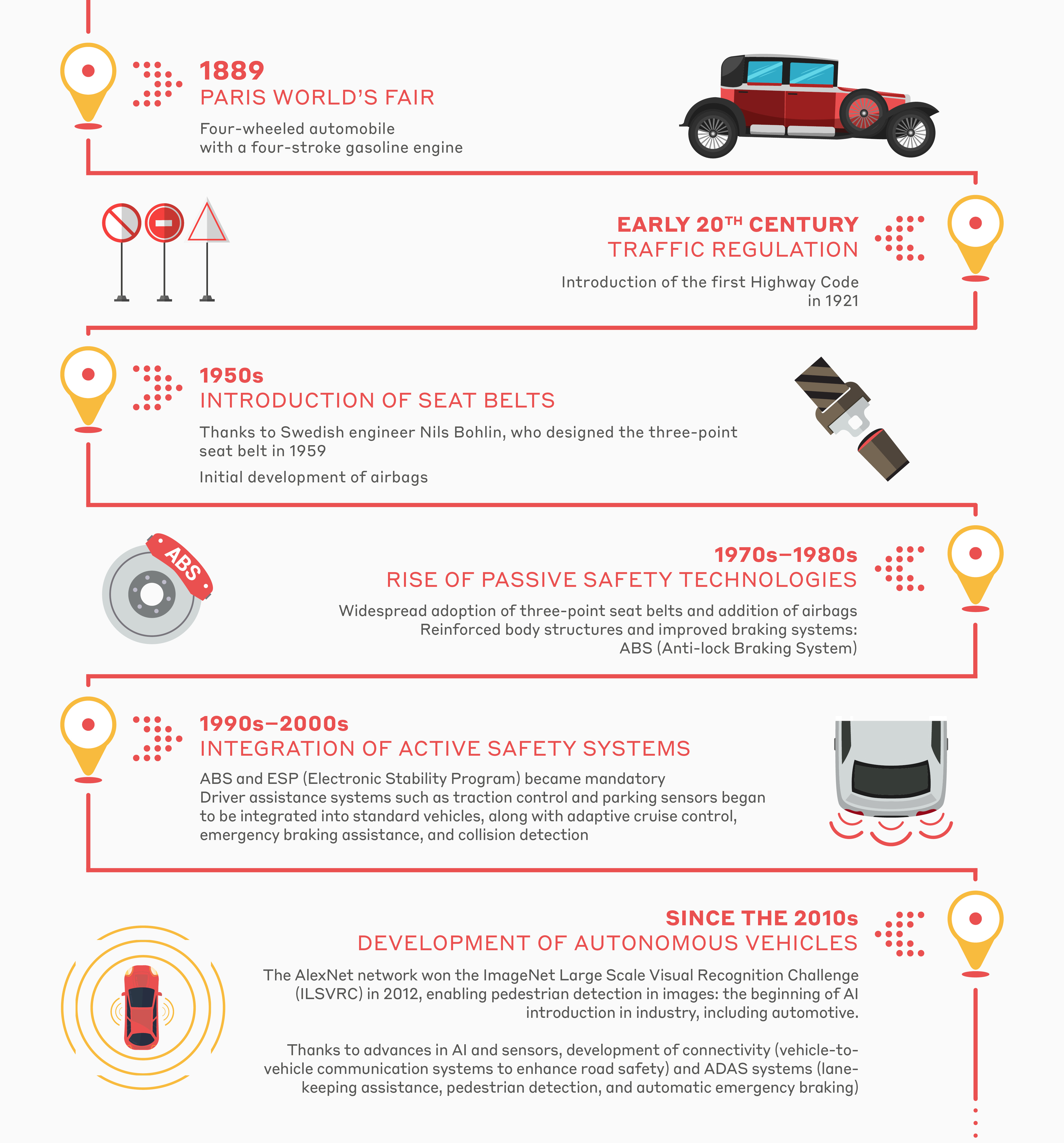 Automotive safety has significantly evolved over the decades, with the introduction of numerous devices and technologies aimed at protecting vehicle users and reducing the risk of accidents. Discover a retrospective of the key safety features in automotive: